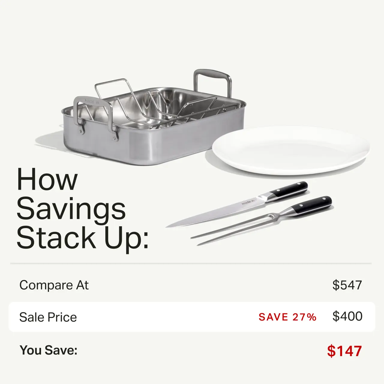 - Roasting Pan & Rack — Holds up to a 24-Pound Turkey, 3-Ply Stainless Cladded Construction, Oven Safe up to 600